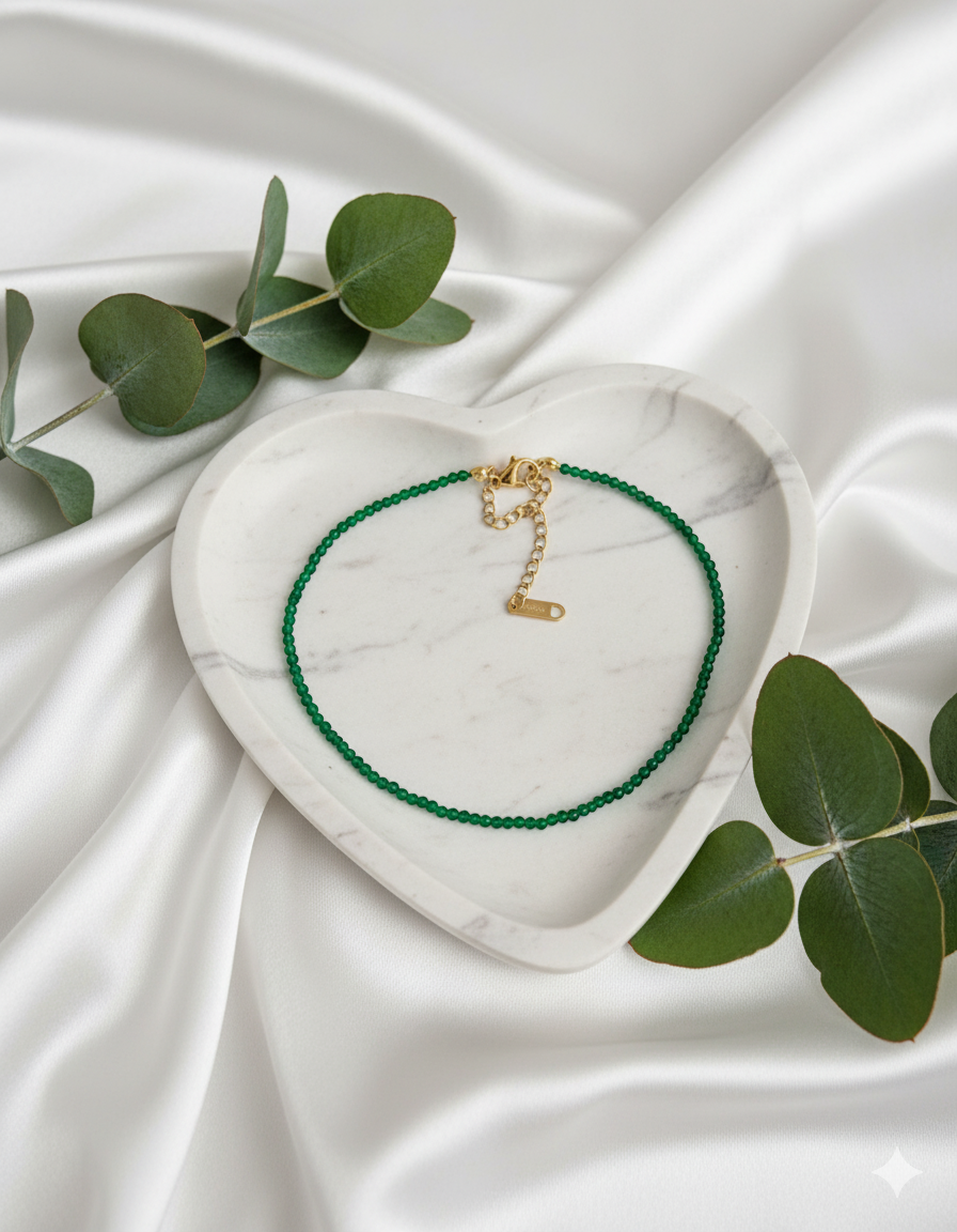 Le Collier Émeraudea séduit par son charme naturel et sa teinte envoûtante. Composé exclusivement de perles vertes lumineuses, il incarne la fraîcheur, l’élégance et la vitalité. Sa fermeture en acier inoxydable doré apporte une touche de raffinement et garantit une résistance parfaite dans le temps.