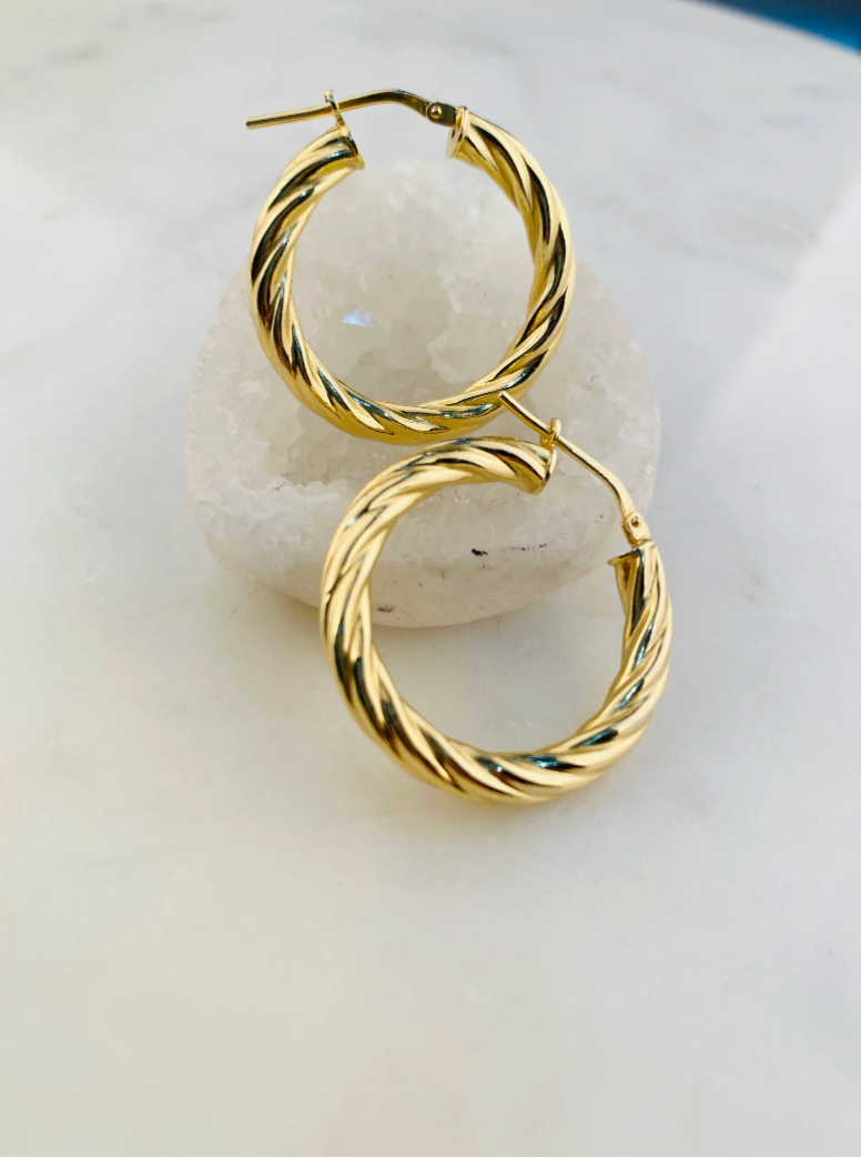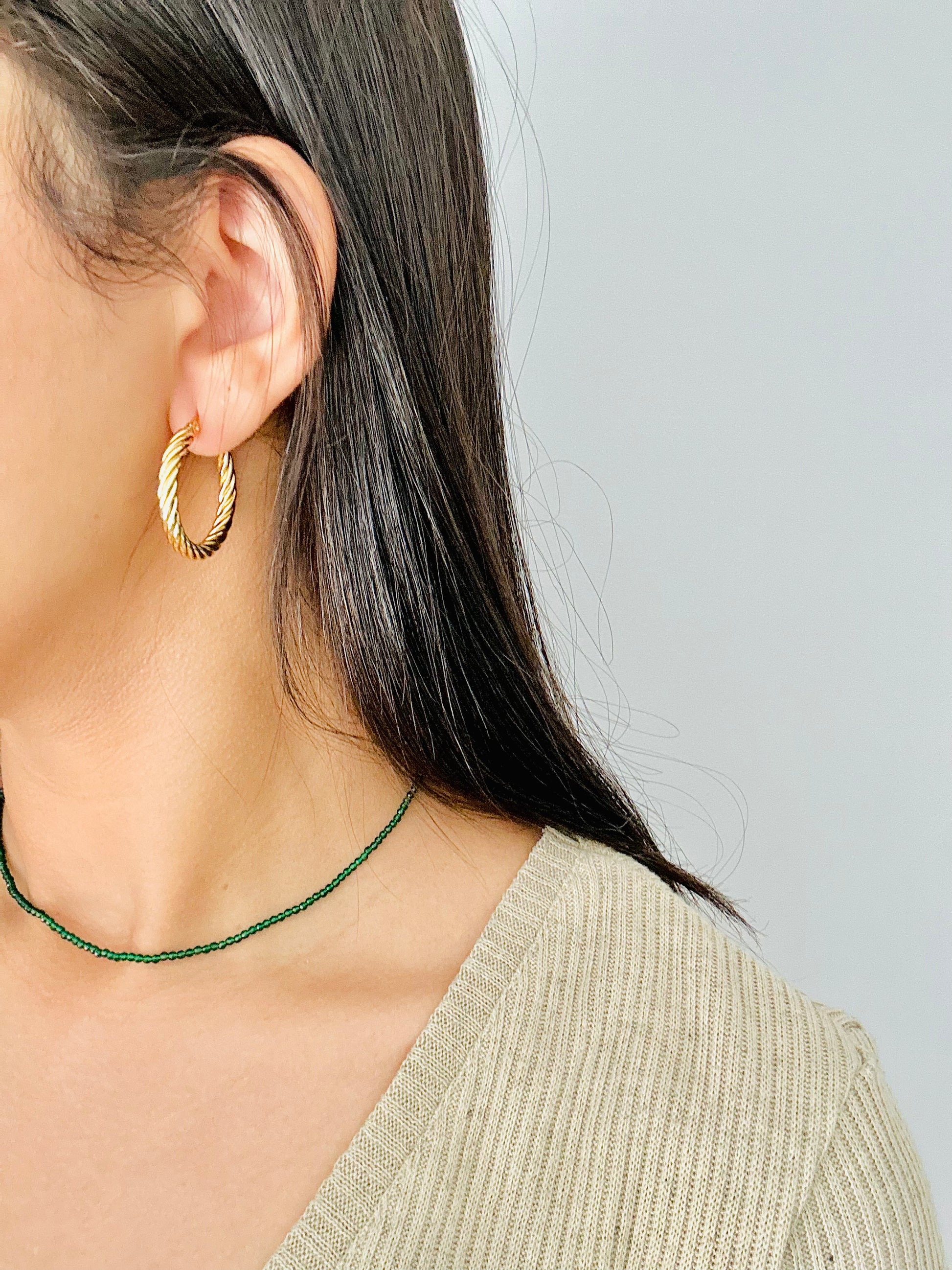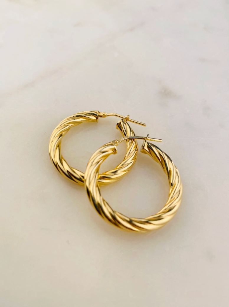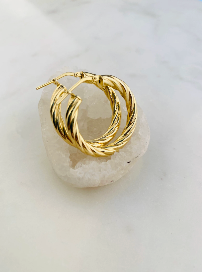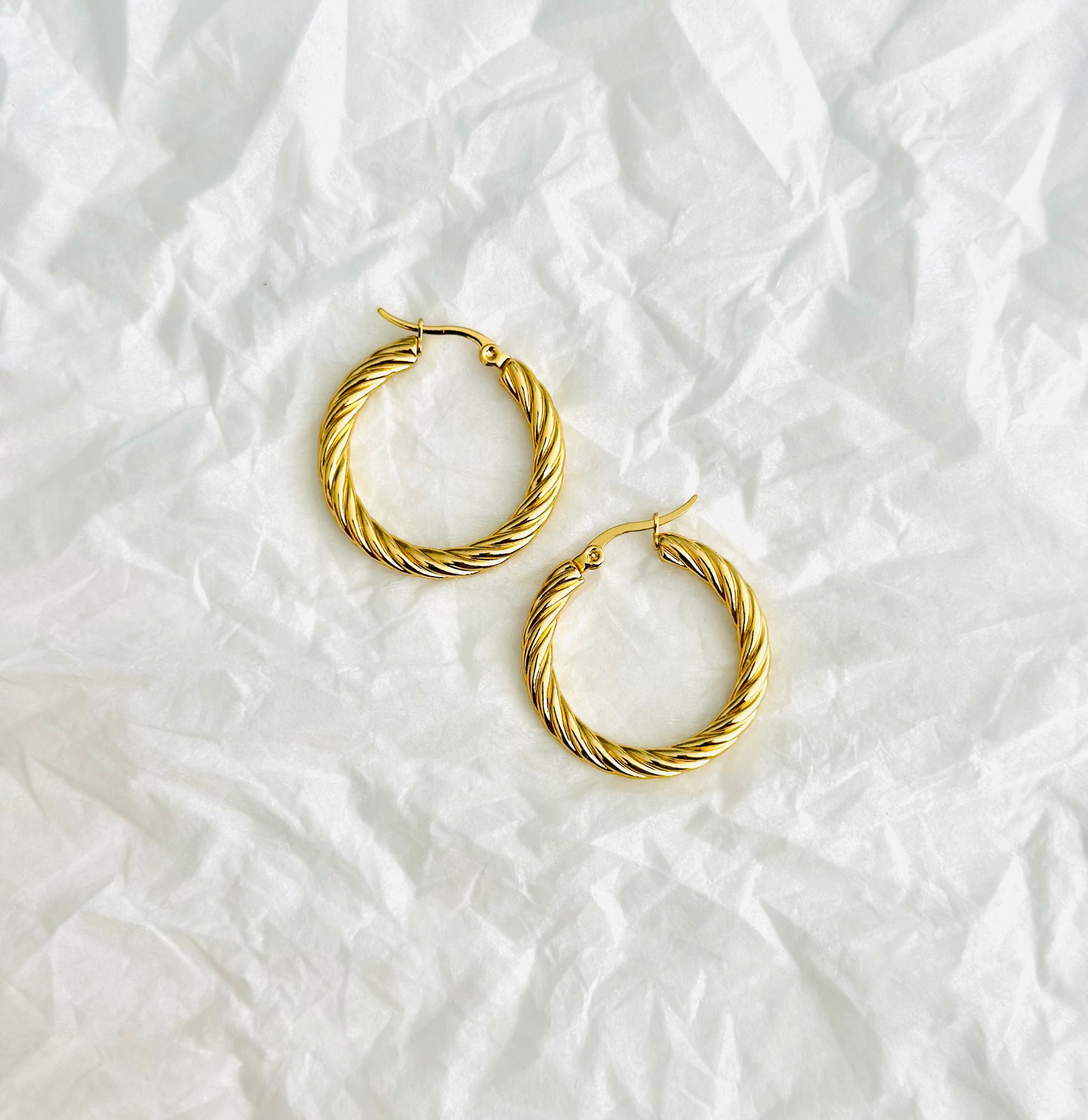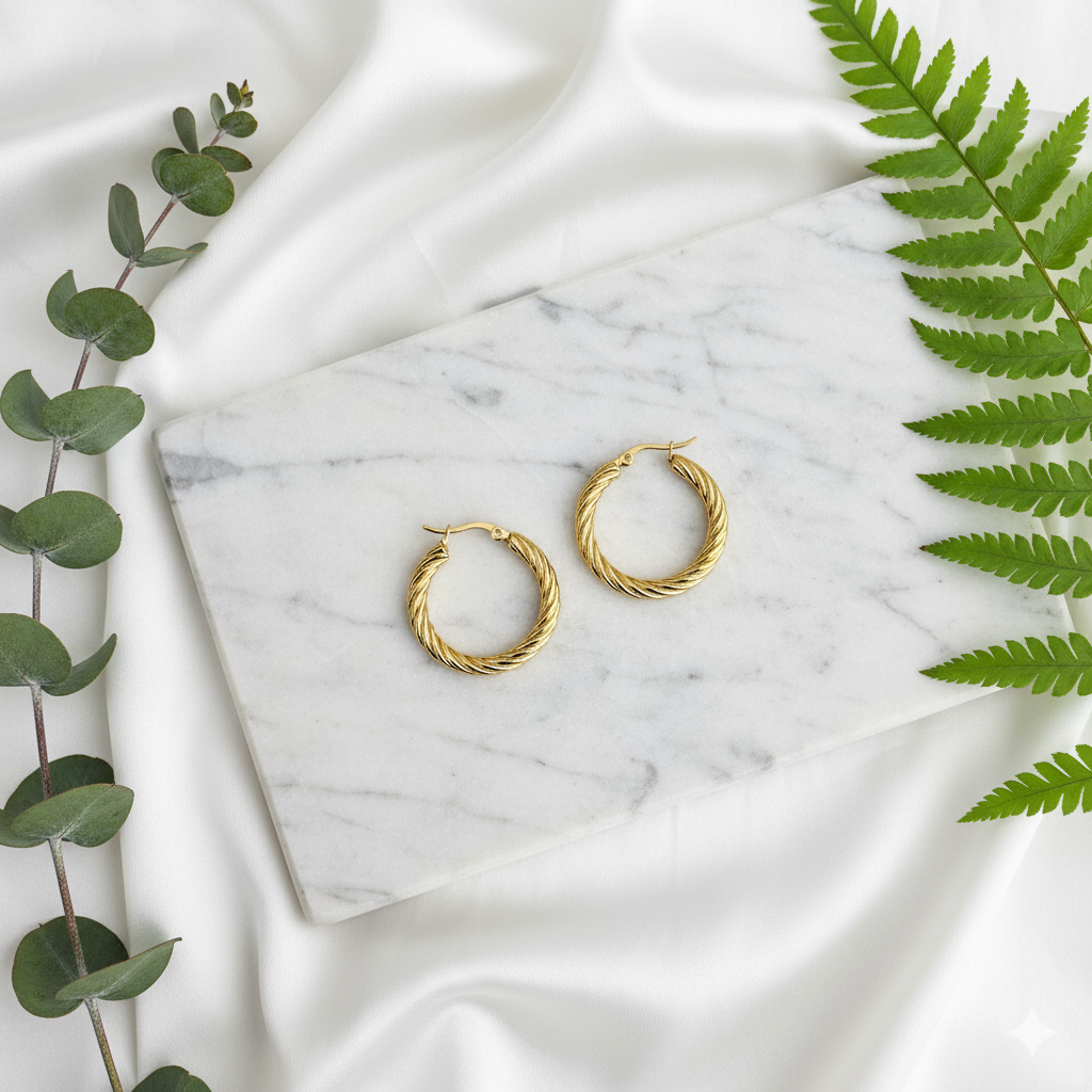 Les Créoles Élyssia en acier inoxydable doré séduisent par leur élégance intemporelle et leur délicat motif torsadé, qui reflète la lumière avec subtilité.
